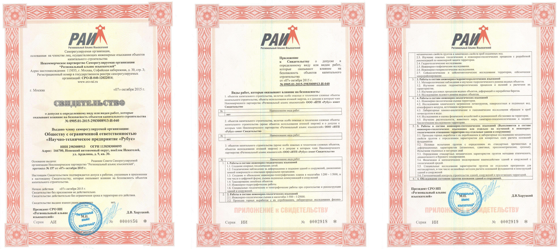 Наша компания, ООО "НТП "Рубус", полностью соответствует действующему законодательству и выполнены все требования и условия Саморегулируемой организации (СРО) некоммерческого партнерства "Российский союз изыскателей". Мы обладаем кадровым составом высококвалифицированных специалистов, собственным высокоточным специализированным оборудованием и транспортными средствами, что гарантирует комплексный подход и высокий профессионализм при выполнении работ.